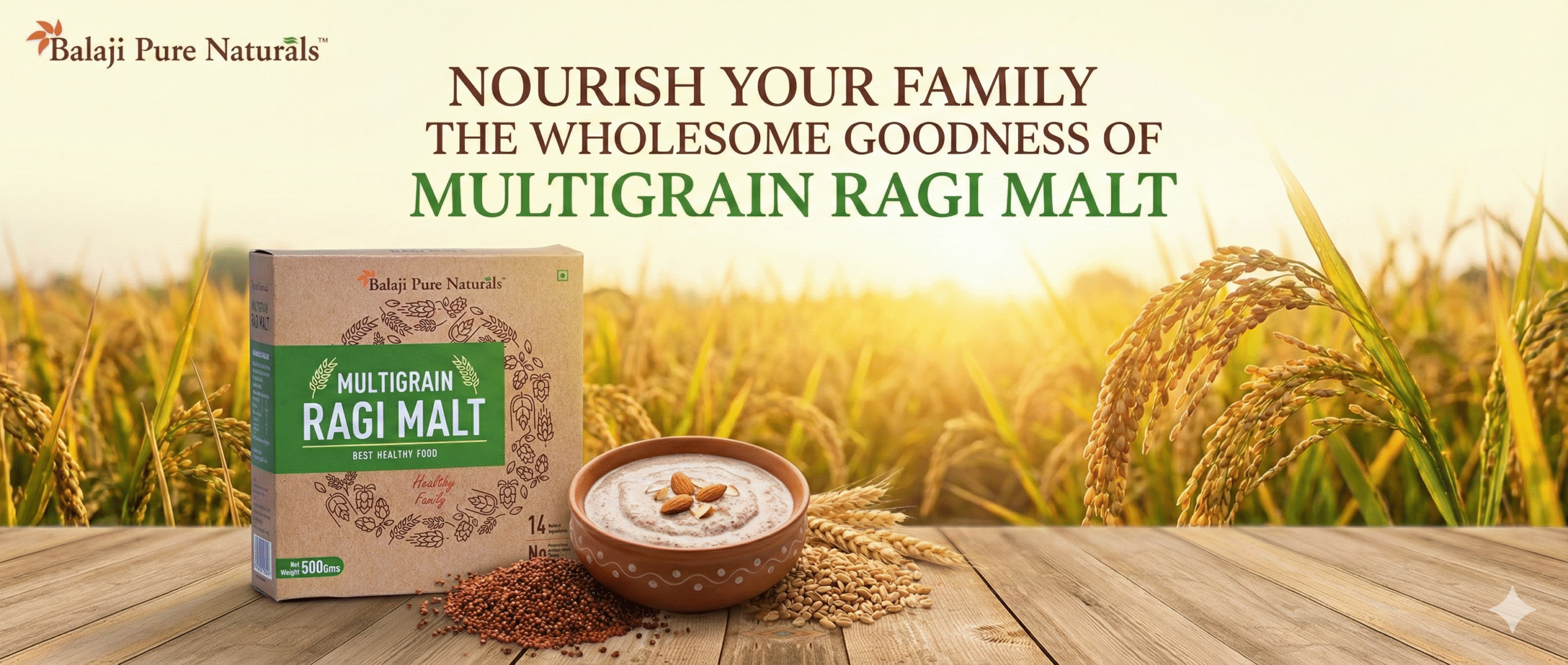 Balaji Pure Naturals Multigrain Ragi Malt is a nourishing health mix crafted using a wholesome combination of traditional grains like ragi, wheat, jowar, bajra, and moong. Rich in natural calcium, iron, fiber, and plant-based proteins, it supports bone strength, energy levels, digestion, and overall growth.